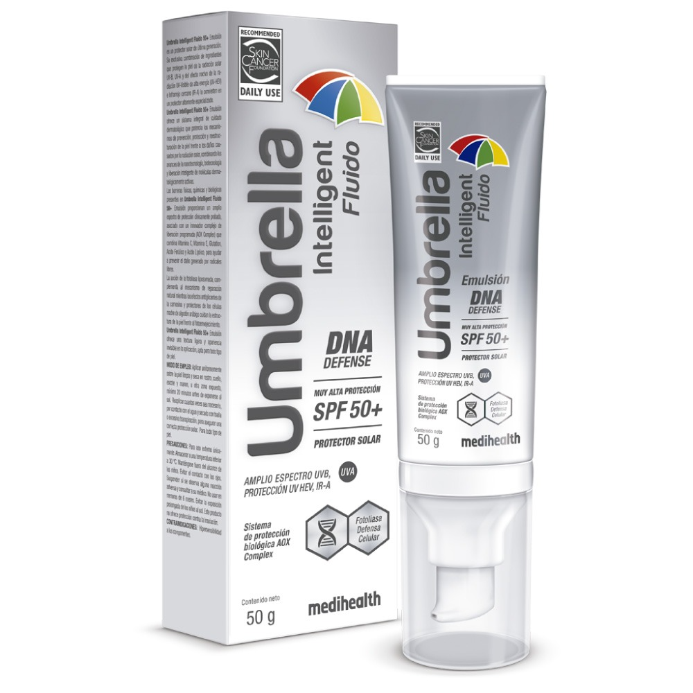 Umbrella Intelligent Fluido SPF 50+ Emulsión es un protector solar en emulsión ultra fluida, con textura ligera y apariencia invisible en la aplicación, que se integra perfecta e inmediatamente con la piel brindando un terminado cosmético insuperable. Ofrece un sistema integral de cuidado dermatológico que potencia los mecanismos de prevención, protección y reestructuración de la piel frente a los daños causados por la radiación solar, combinando los avances de la nanotecnología, biotecnología y liberación inteligente de moléculas dermatológicamente activas.